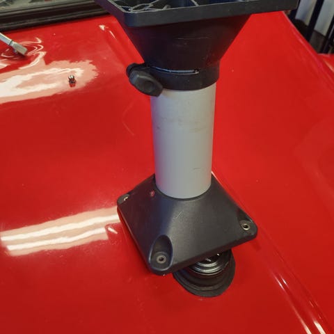 Pyörivä istuimen jalka korkeussäädöllä. Käytetty mutta ehjä. Korkeus 45-31cm. Kiinnitysjako käy kaikkiin yleisimpiin istuimiin.