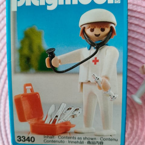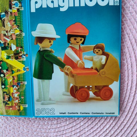 Playmobil 3583 Vintage leikkisetti, jossa aikuishahmo, kaksi lapsihahmoa sekä vihreä leikkikehä ja sänky. Muovinen setti sopii yhteensopivaksi muiden Playmobil-hahmojen ja -osien kanssa. Setti kuvaa hoitotilannetta tai leikkihetkeä aikuishahmon ja lasten välillä ja soveltuu roolileikkeihin ja kokoelman täydentämiseen.