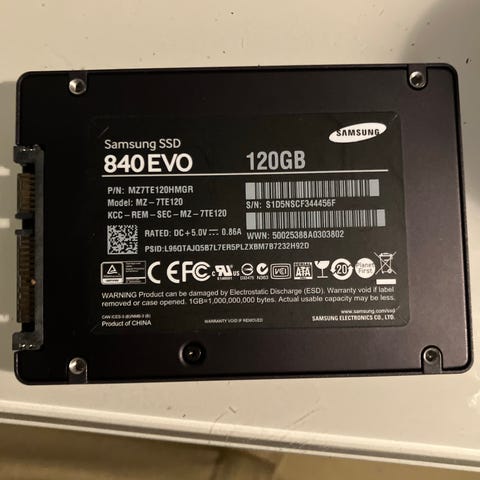 Samsung 840 EVO SSD -levy, tallennuskapasiteetti 120 GB. 2,5 tuuman kokoinen sisäinen SATA-kiintolevy (solid state drive), soveltuu käytettäväksi esimerkiksi pöytäkoneissa ja kannettavissa, joissa on 2,5" SATA-liitäntä. Väriltään musta kotelo, etupuolella Samsung Solid State Drive -merkintä ja takapuolella mallimerkintä 840 EVO 120GB.