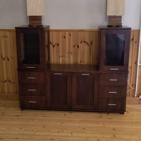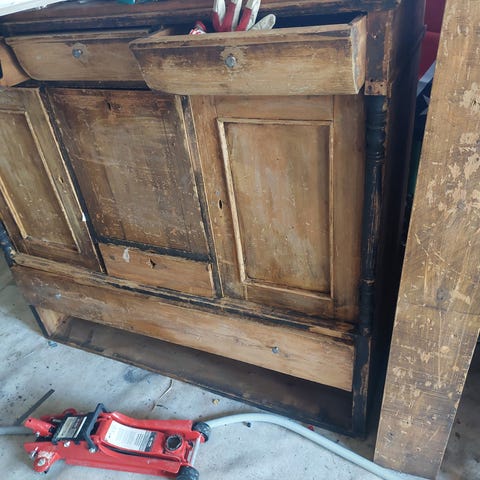 Annetaan apteekkarin lipasto. Alettu entisöimään mutta into lopahti.