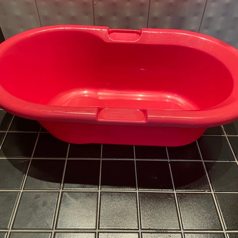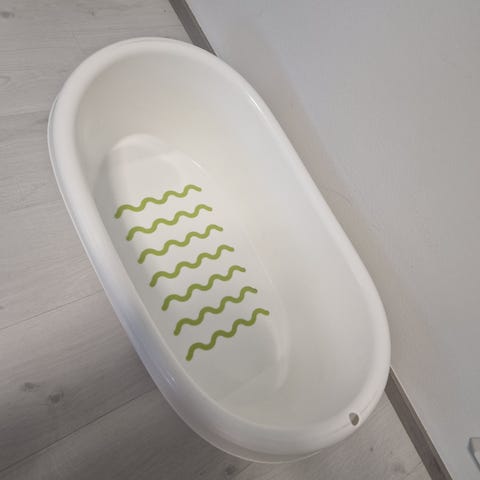 Valkoinen vauvan kylpyamme, jossa vihreät liukuestekuviot pohjassa.