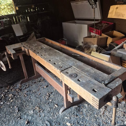 Puinen työpöytä / puusepän työpenkki, jossa täyspuinen runko ja kansi. Työpenkissä on useita reikiä puristimille tai työkaluille sekä alakaapisto ovilla lisäsäilytystä varten. Soveltuu puutöihin, verstaaseen tai varastotilaan tukevaksi työskentelytasoksi ja työkalujen säilytykseen.