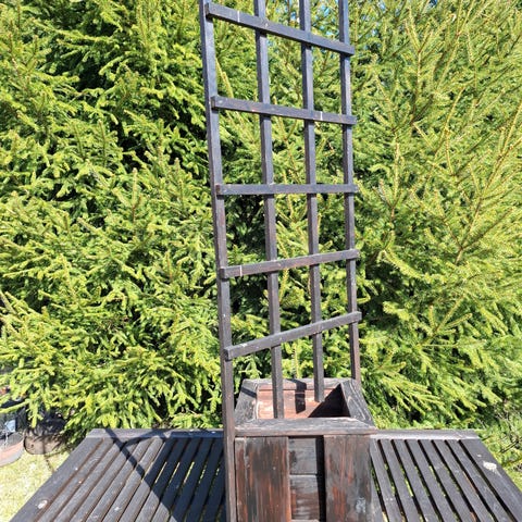 Hyväkuntoinen tummanruskea ristikko/kehikko esimerkiksi köynnöskasveille. Vain haku Lahdessa. Leveys 90cm pituus n. 178cm.