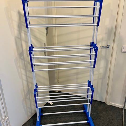 Korkeus säädettävissä 120-250cm, kantavuus 3kg. Sisältää 3 hyllyä. Ehjä siisti kunto, kasattavissa ilman työkaluja. Teline puristuu lattian ja katon väliin.