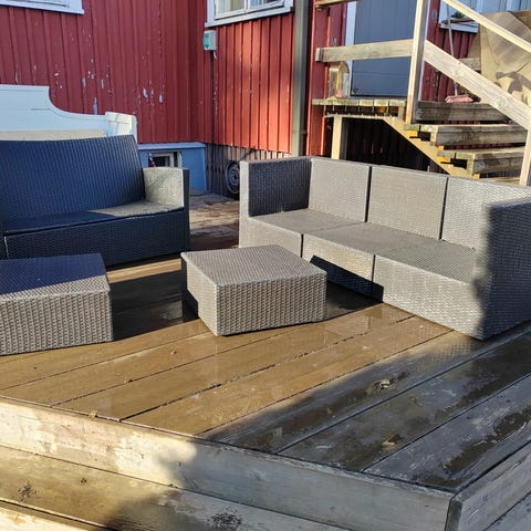 Parvekesohvaryhmä, johon kuuluu kaksi käsinojallista tuolia, kaksipaikkainen sohva sekä suorakaiteen muotoinen sohvapöytä. Kalusteet ovat mustaa polyrottinkia ja istuimissa on tummat pehmusteet. Pöydässä on lasinen kansi ja alataso säilytystä varten. Lisäksi kokonaisuuteen kuuluu erillinen vaaleanharmaa, sylinterin muotoinen sivupöytä tai jakkara, jossa on kantamista helpottava köysikahva. Sopii parvekkeelle tai terassille.