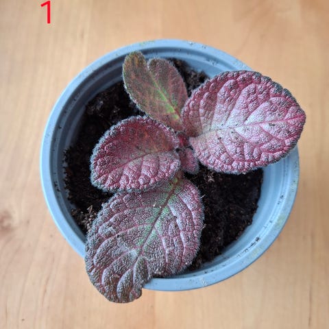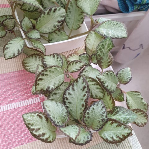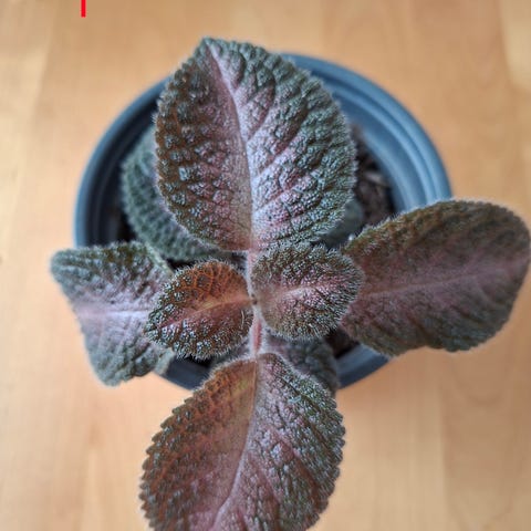 Vanhanajan kuparilehti Episcia Cupreata. Tykkää valoisasta paikasta ja säännöllisestä kastelusta, mitä valoisampi paikka sen kauniimmat kuparinhohtoiset lehdet. Kukkii oranssinpunaisin kukin.
