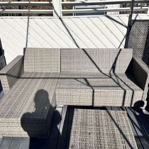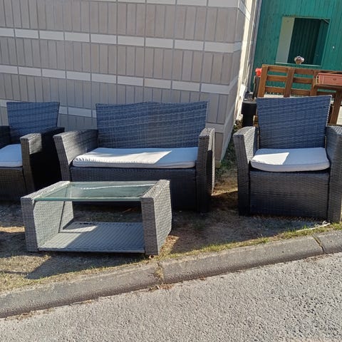 Jyskin kaksi Ravndrup sohvamoduulia, kulma ja keskipala. Polyrottinkirunko ja irrotettavat harmaat istuin- ja selkätyynyt. Tyynyjen päälliset vetoketjullisia. Toisen istuintyynyn vetoketju rikki, muuten hyvässä kunnossa. Ollut lasitetulla parvekkeella ja talvella pehmusteet säilytetty sisällä.