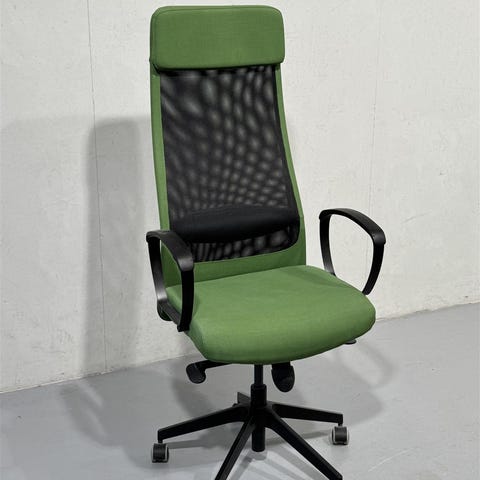 Ikea Markus siisti työtuoli, jossa on korkea selkänoja ja säädettävä istuinkorkeus. Vihreä kangasverhoilu ja musta verkkoselkänoja. Pyörillä varustettu jalusta helpottaa liikkumista.