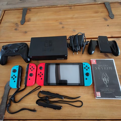 Nintendo switch ja kolme peliä. Kaikki mitä kuvassa näkyy.