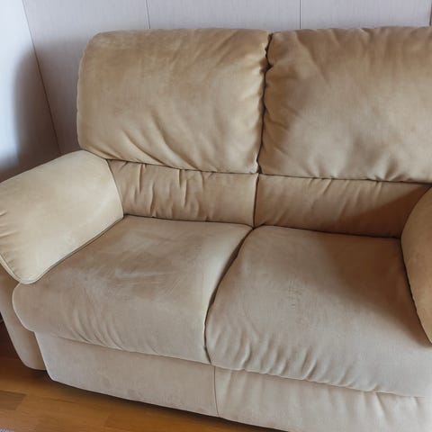 Sohva on käytetty, mutta siisti ja tukeva. Kankaassa on käytön jälkiä ja pinnassa on eläimen karvaa, joten suosittelen puhdistusta ennen käyttöä.