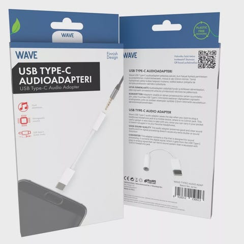 Wave USB‑C audioadapteri – laadukas ääni laitteisiin ilman 3,5 mm liitäntääWave USB‑C audioadapteri on kätevä ratkaisu silloin, kun haluat käyttää perinteisiä 3,5 mm kuulokkeita tai äänilaitteita mobiililaitteessa, josta kuulokeliitäntä puuttuu. Kompakti ja kevyt adapteri kulkee helposti mukana taskussa, repussa tai valmiiksi kiinnitettynä suosikkikuulokkeisiisi. Laadukas D/A‑muunnin varmistaa kirkkaan ja häiriöttömän äänen ilman rätinöitä tai pätkimistä.Adapterin sisäänrakennettu konvertteripiiri muuntaa USB‑C‑liitännän digitaalisen signaalin analogiseksi, jolloin ääni voidaan syöttää luotettavasti 3,5 mm liittimellä varustettuihin kuulokkeisiin, kaiuttimiin tai muihin äänentoistojärjestelmiin. Kestävä rakenne ja 9 cm pituus tekevät siitä käytännöllisen arjen apurin.Huom: Apple‑laitteet eivät tue tätä tuotetta. USB‑C → 3,5 mm audioadapteriLaadukas D/A‑muunninSelkeä ja häiriötön äänenlaatuSisäinen konvertteripiiri digitaalisen signaalin muuntamiseenPituus: 9 cmKevyt ja helposti mukana kulkevaYhteensopiva useimpien USB‑C‑laitteiden kanssaEi yhteensopiva Apple‑laitteiden kanssa
