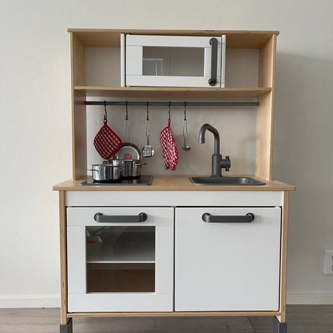 leikkikeittiö muovia. Leikkikeittiössä on liesi, uuni, pesuallas ja yläosa, jossa mikroaaltouunin näköinen kaappi sekä koukut keittiövälineille. Mukana tulee erilaisia muovisia keittiötarvikkeita ja leikkiruokia, kuten kattiloita, pannuja, lautasia, kuppeja, ruokailuvälineitä, leikkuulauta, kaulin sekä juomapulloja ja purkkeja muistuttavia osia. Soveltuu lasten roolileikkeihin sisäkäyttöön.