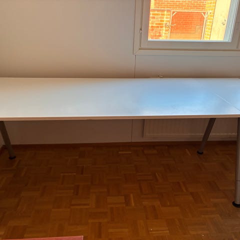 Myydään valkoinen työpöytä. Pöytä saatiin edelliseltä vuokralaiselta, ja sitä on käytetty lähinnä kirjojen, kasvin ja pienten tavaroiden säilyttämiseen.