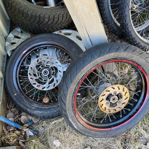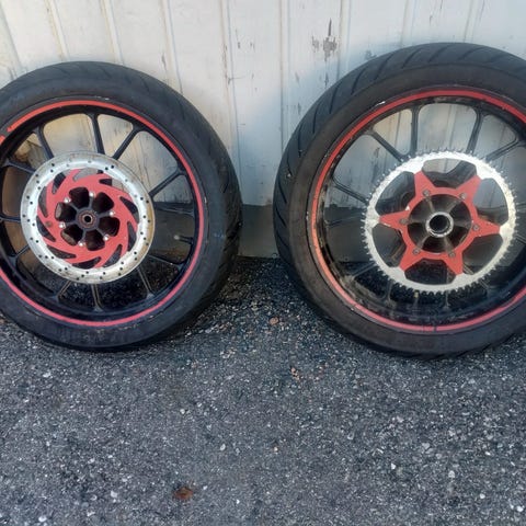 Hyvä kuntoiset smotot pikkunaarmuja löytyy vanteista mutta ei mitään mitä edes huomaa kaukaata. (Takarengas 130/70-17) (eturengas 100/80-17)