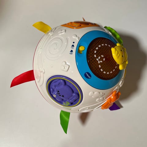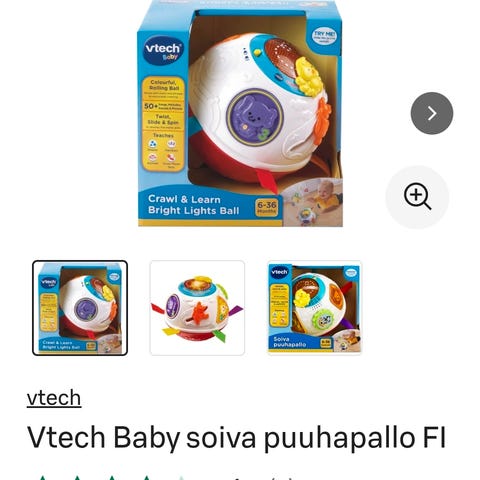 Vtech puuhapallo, toimiva ja nätisti leikitty. Soittaa musiikkia ja pyörii itsekseen kannustaen lasta liikkumaan perässä.