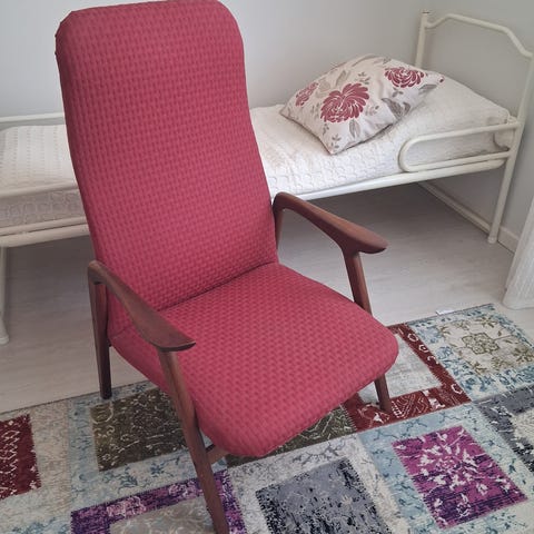 Ruusukuvioinen nojatuoli sekä rahi. Tuoli on vanha, jossa jouset istuimessa, hieman normaalia matalampi malli.