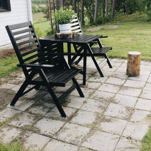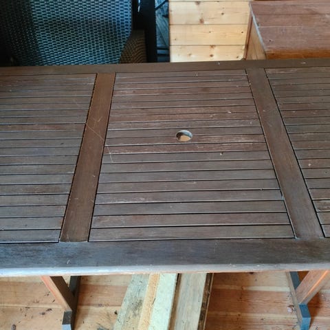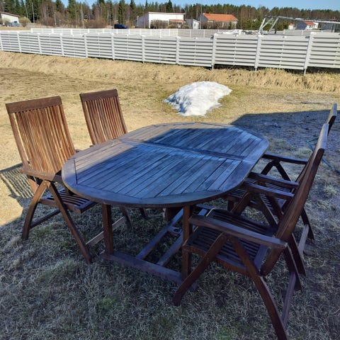Terassikalusteet. Materiaali tiikki. Kuusi tuolia joissa selkänojan kallistus ja kaikkiin pehmusteet. Kuvissa ei pehmusteet paikallaan. Pöytä on jatkettava malli jolloin kuusi tuolia mahtuu vierekkäin pöydän ääreen.