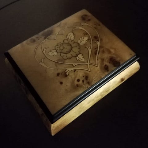 Myydään kaunis, vintage-tyylinen puinen koru- ja soittorasia. Rasian kannessa ja sivuilla on satumainen kuvitus sateenkaarilla ja sydämillä.