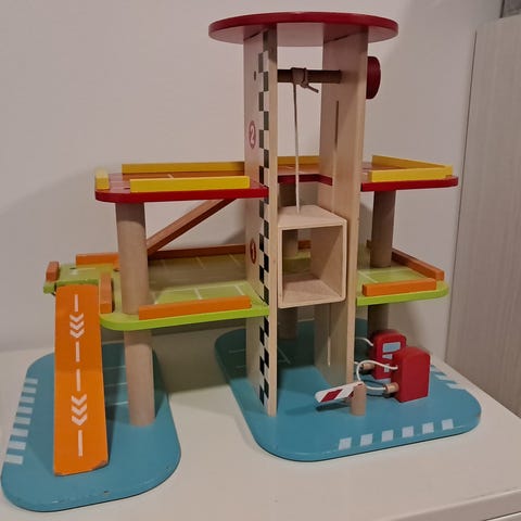 Puinen parkkitalo. Hissin naru poikki, muuten hyvä leikitty kunto.