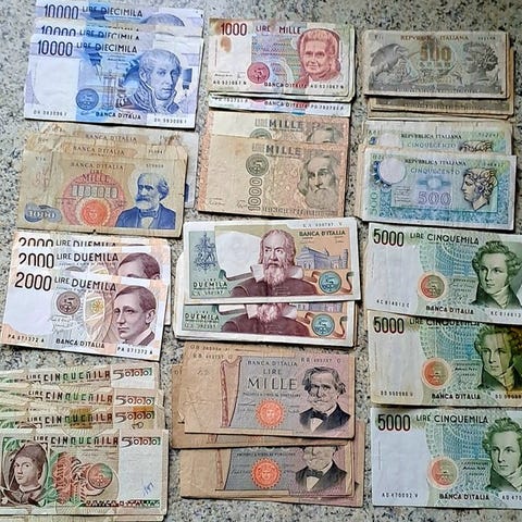 Italia.27 setelin erä.Huomioitavaa:2 x 10 000 lirejä, sarja X.2 x 50 000 lirejä.2 x 10 000 lirejäja muita,kuten kuvasta näkyy