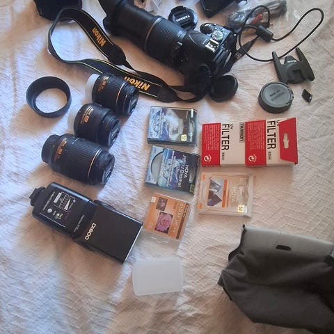 Laukku, jalusta, muistikortti 64gb ja kortinlukija.