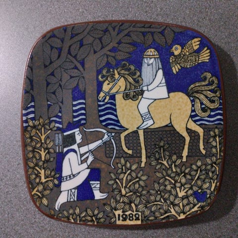 Arabian vuosilautanen 1985, pakkkauksessaan. Design: Raija Uosikkinen.