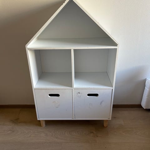 IKEA lasten kaapisto ja hyllystö, jossa yhdistyvät korkea kaappi, avohylly ja matalammat säilytysosat. Kokonaisuus on pääosin valkoinen, ja alalaatikoissa on mustat etupaneelit. Avohyllyssä on useita tasoja kirjoille ja pienille tavaroille, ja suljetut osat tarjoavat lisäsäilytystilaa esimerkiksi leluille tai vaatteille. Sopii lastenhuoneen säilytysratkaisuksi.