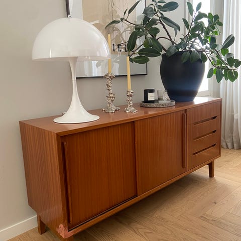 Kivan kokoinen ja perussiisti teak senkki liukuovilla ja ilmavilla pinnijaloilla. Sopii kokonsa puolesta moneen tarkoitukseen. Ollut jossain vaiheessa valkoiseksi maalattu, josta vielä siellä täällä jälkiä. Ulkopinnat kuitenkin kohtuullisen siistit.