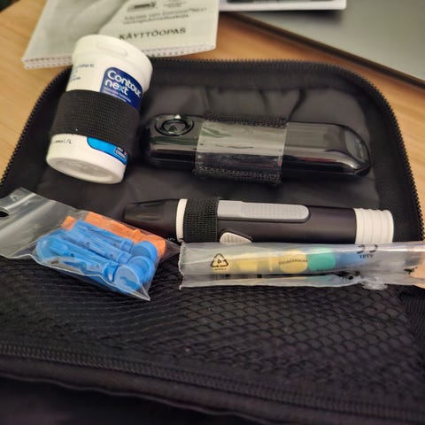 Pelkkä mittari ja säilytys pussukka. Liuska purkki on tyhjä mutta siinä näy mitkä liuskat sopii.
