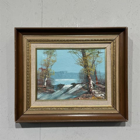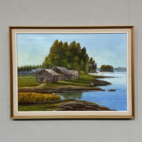 Hakusanat: maalaus, taide, maisema, järvimaisema, Paketoitava, öljyvärimaalaus, realistinen, 1980-luku, suomalainen taide, p. koskinen
