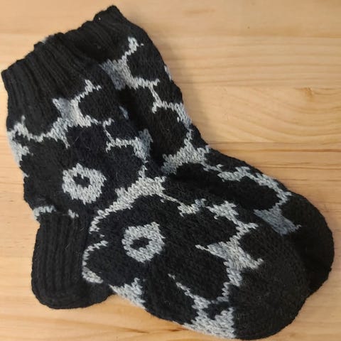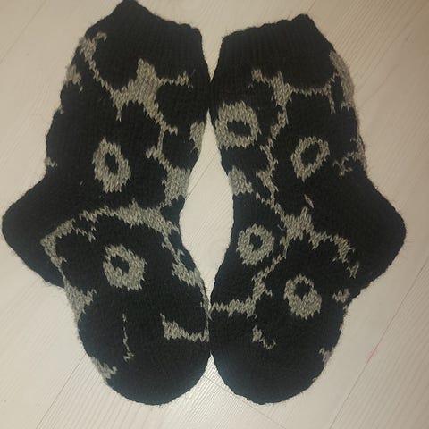 Neulottu huolellisesti 7-veljestä langasta vahvistetulla kantapäällä.
