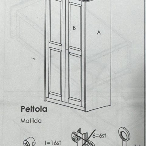 Peltola Matilda valkoinen vaatekaappi, joka on purettu osiin (mukana kasausohjeet). Kaapissa on kaksi ovea, sisällä rekki ja tasoja ja se on suunniteltu vaatteiden säilytykseen. Mukana tulee tarvittavat kiinnikkeet ja osat. Kaapissa on havaittavissa pieniä kolhuja ja kulumia, mutta se on muuten hyvässä kunnossa.