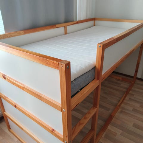 Täysin ehjä ja hyväkuntoinen parvisänky.Maalattu uudestaan,ei tarroja.Ei patjoja mukaan.