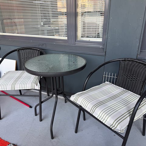 Parvekesetti, johon kuuluu pyöreä lasikantinen pöytä ja kaksi käsinojallista tuolia. Tuolit ovat tumman harmaata polyrottinkia. Istuintyynyt haalistuneet auringossa ja toinen hieman raspiintunut. Muuten tuolit hyvässä kunnossa. Pöydässä on metallirunko ja lasikansi, kunto erittäin hyvä. Käytetty lasitetulla parvekkeella.