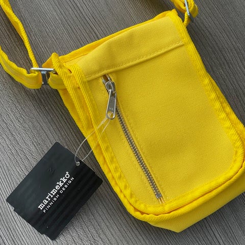 Marimekko olkalaukku naisten. Laukku on valmistettu tekonahkasta ja sen pääväri on keltainen. Laukussa on kaksisuuntainen vetoketjusuljenta ja sisällä erillinen vetoketjutasku pienille tavaroille. Säädettävä, musta leveä olkahihna on kuviollinen ja irrotettava metallikoukuilla. Ostettu ja vaihdettu musta hihna toisesta laukusta beigen sijaan. Yhdenkerran käytetty, jokin pieni jälki tullut (katso kuvat), mutta ei merkittävä.
