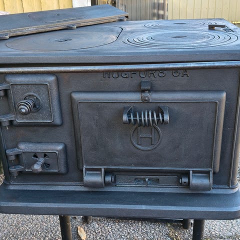 Valurautainen puuhella, jossa useita valurautaisia keittolevyjä ja irrotettavia rengasosioita ruoanlaittoon. Etuosassa on erilliset luukut tulipesälle, uunille ja tuhkalaatikolle. Hellassa on lisäksi vesiliiteri tai lämminvesisäiliö hanalla. Runko on ruskea ja luukut sekä jalat hopeanväristä metallia. Sopii puulla lämmittämiseen ja ruoanlaittoon esimerkiksi mökille tai perinteiseen keittiöön.