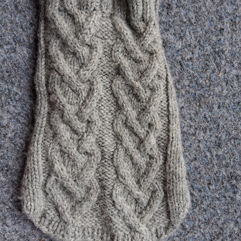 Beige neulekoira-asu palmikkokuviolla. Pehmeä ja joustava neulos, jossa korkea kaulus ja aukot etujaloille. Sopii koiralle lisälämmöksi viileään säähän. Pituus mitattuna selän suuntaisesti näkyy kuvissa mittanauhan vieressä. Soveltuu pienelle tai keskikokoiselle koiralle koosta riippuen; tarkat mitat voi arvioida kuvien perusteella.