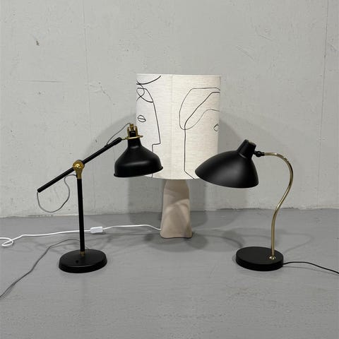 Kolme erilaista pöytävalaisinta, joissa on moderni muotoilu. 1) Ikea Ranarp pöytävalaisin2) Sessak Jayden pöytälamppu3) Vaalea HKliving Printed Faces Lamp Shade L varjostin yhdistettynä Hemtex lampun jalkaan, jossa nivelellä kääntyvä lampunkanta.