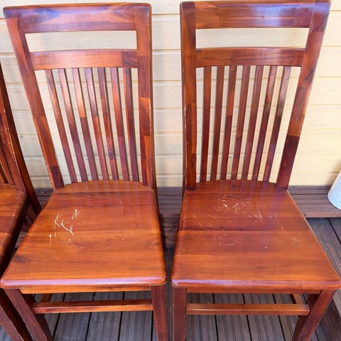 Yhdessä tuolissa murtuma jalassa, ei ole vaikuttanut käyttöön, eikä juuri näy ellei kurki tuolin alle. Pientä käytön jälkeä löytyy jokaisesta tuolista, mutta yleisilme todella siisti.