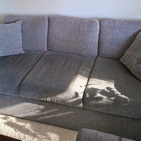 Harmaa 3-istuttava kangassohva puujaloin. Sohvassa on suorat käsinojat ja irrotettavat selkä- ja istuintyynyt. Päällinen on vaaleanharmaata kangasta, ja jalat ovat puuta. Sopii olohuoneeseen tai muuhun oleskelutilaan istuma- ja lepotilaksi useammalle henkilölle. Myydään muuton tieltä. Liian suuri uuteen asuntoon.