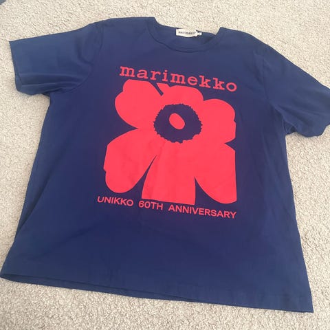 Marimekko t-paita. Kerran pidetty ja hieman lyhyeksi itselle todettu. Valkoinen, edessä sininen unikko.