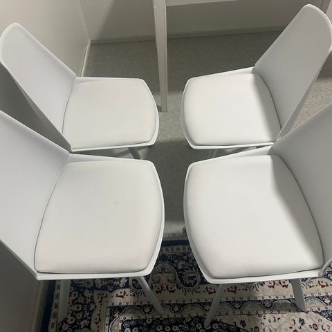 Jysk tuoli valkoinen puujaloin. Tuolissa on valkoinen muovinen istuinosa ja selkänoja sekä vaalea, pehmustettu istuin. Jalusta koostuu vinosti asennetuista puujaloista, jotka on kiinnitetty metallisella tukirakenteella istuinosan alle. Sopii esimerkiksi ruokapöydän tuoliksi tai lisätuoliksi olohuoneeseen tai työtilaan. Tuolit olleet käytössä n. 9kk ja tarpeetoman myydään. Kulkeutuu Varkaus-Heinola-Lahti akselilla. Sovittaessa vaikka Turkuun. Edelleen Jyskin valikoimassa, nyt edullisesti.