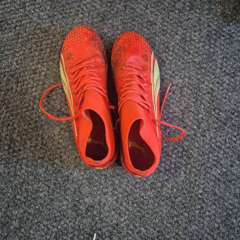 Vähän likaiset mutta ehjät Puma King jalkapallokengät. Kengät ovat matalavartiset nappulakengät, joissa on nauhakiinnitys. Väri on keltainen mustilla yksityiskohdilla ja pohjassa on kelta-punainen nappulapohja. Päällinen on synteettistä materiaalia. Sopivat jalkapallon pelaamiseen ulkokentillä.