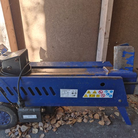 Scheppach hydraulinen halkomakone. Laitteessa on pituussäätö, mikä nopeuttaa erimittaisten puiden käsittelyä. Samasta syystä siinä on myös stoppari, mikä estää männän palautumisen jokaisen halkaisun jälkeen alkuasentoon. Laite sijaitsee Siuntiossa.