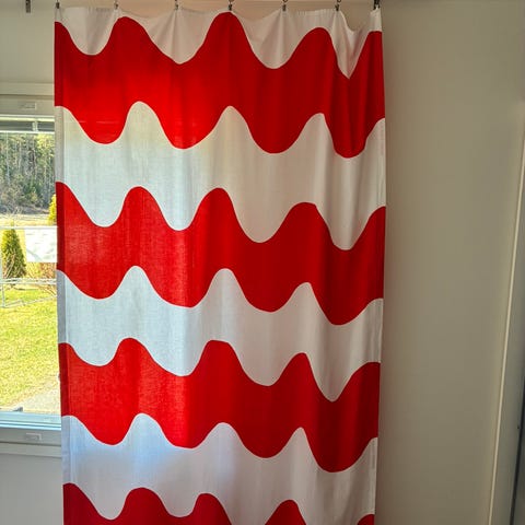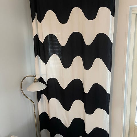 Marimekko Lokki verhot mustavalkoinen kuviollinen puuvilla. Verhoissa on suuri aaltoileva Lokki-kuosi mustan ja valkoisen sävyissä. Materiaali on puuvillaa, joka sopii olohuoneen tai ruokailutilan ikkunaverhoiksi. Verhot voidaan ripustaa esimerkiksi verhokiskoon tai -tankoon riippuen yläreunan ompelusta ja kiinnitystavasta. Soveltuu käytettäväksi sisätiloissa kodin sisustuselementtinä, 5kpl.Hinta 60€/kpl+pk
