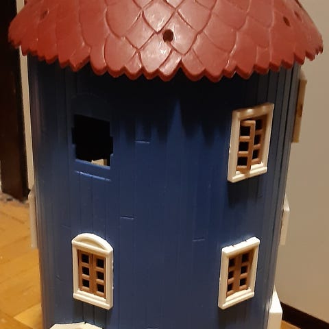 Muumitalo ja sekalainen setti hahmoja ja kalusteita. Hyvässä kunnossa. Katon "piippu" uudelleen liimattu ja siinä vähän kuivunutta liimaa (katso viimeinen kuva).