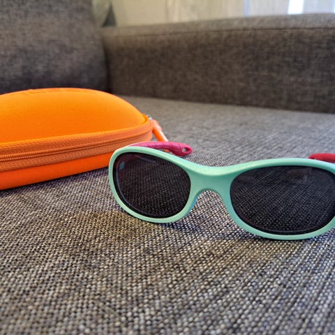 Hyväkuntoiset Reima lasten aurinkolasit. Kehykset ovat puunväriset ja linssit tummat. Suojapussi mukaan.