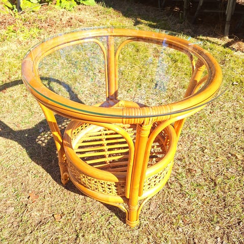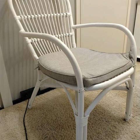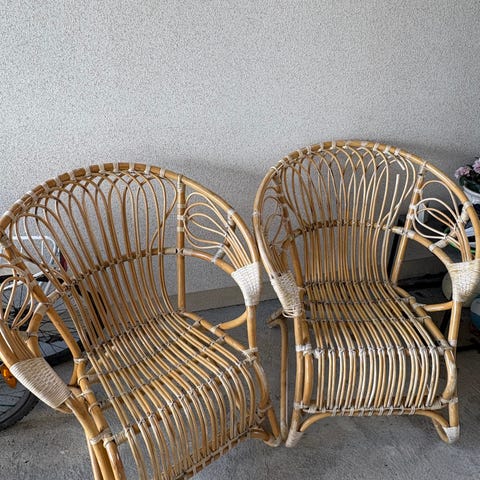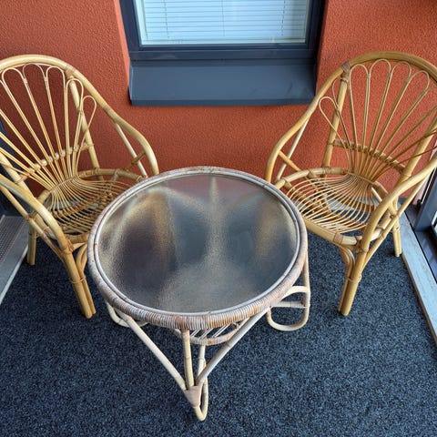 Myydään kolme rottinkituolia ja lasinen rottinkipöytä. Tuolit ovat todella tukevat eivätkä natise. Pehmusteet täysin ehjät, niissä muutama pieni väriläikkä. Lakkaukset paikoin hävinneet. Sarja tyylikäs ja hyväkuntoinen. Nouto.