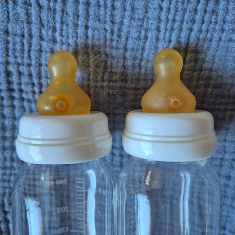 Kaksi Lifefactoryn lasista tuttipulloa. Vetävyys 120ml. Mukana tuttiosia ja kaksinokkamukipäätä.