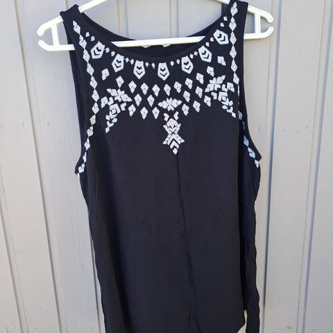 Kiva toppi kirjoituksella. Kiinnitys nauhoilla niskan taakse. Vaate on leikattu niin, että se levenee alaspäin ja helmasta tulee runsas. Laskeutuu tosi kauniisti!